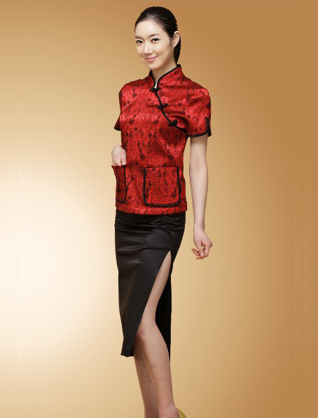 广东订做酒店红色短袖餐饮制服,中餐员工服装定做厂家 安徽定做餐饮服务员工作服,酒楼制服订做设计款式 订制酒店制服款式,中式酒店服图片